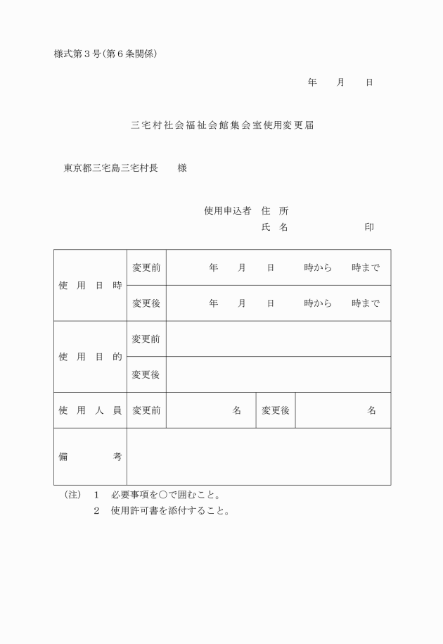 第6条 集会室の使用を変更する者は、三宅村社会福祉会館集会室使用変更届(様式第3号)を村長に届出なければならない。