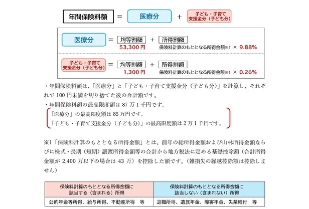 保険料は被保険者一人ひとりにかかります。保険料は「医療分」と「子ども・子育て支援金分(子ども分)」で構成され、被保険者に均等にご負担いただく均等割額と被保険者の前年の所得に応じていただく所得割額の合計額となります。